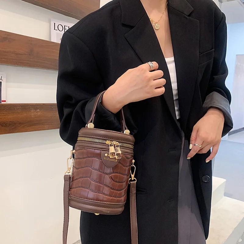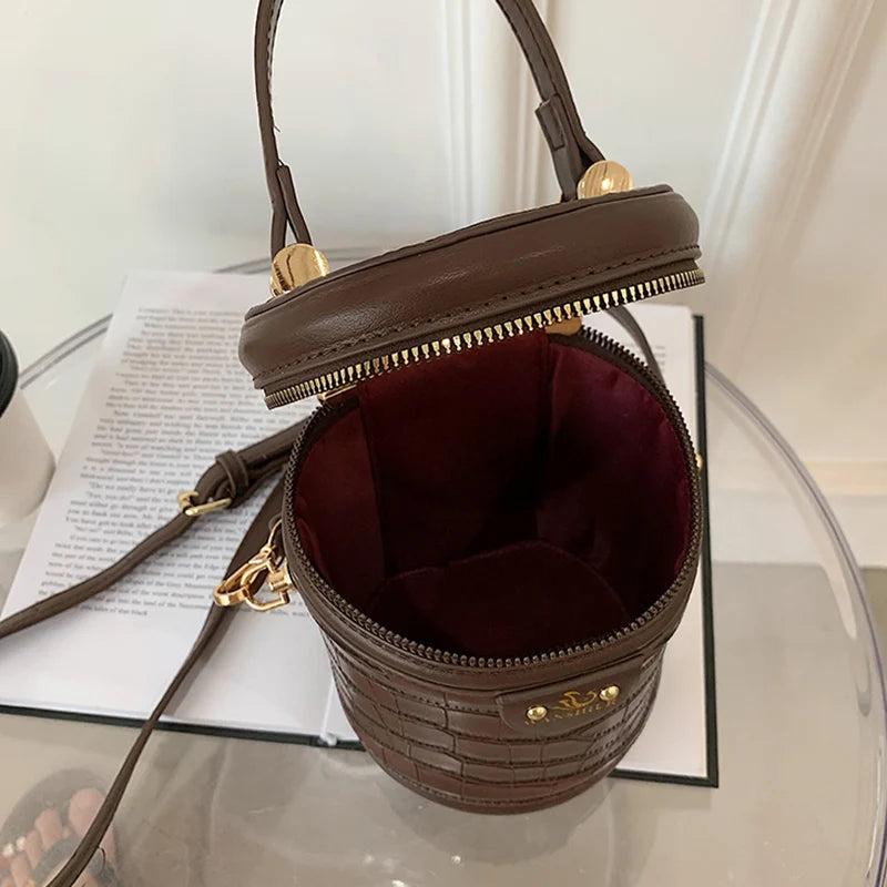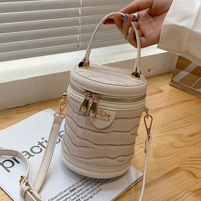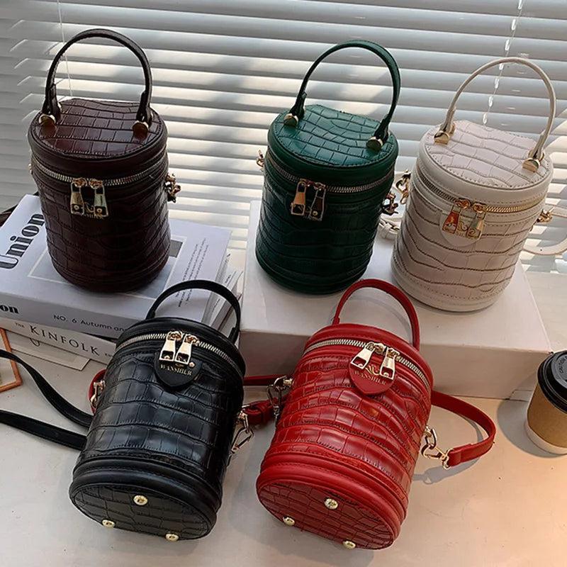 This stylish bucket bag features a unique circular barrel design, perfect for adding a touch of color to your outfit. The versatile design allows you to wear it as a shoulder bag or clutch for any occasion.