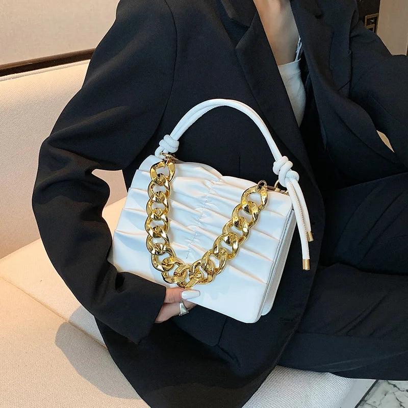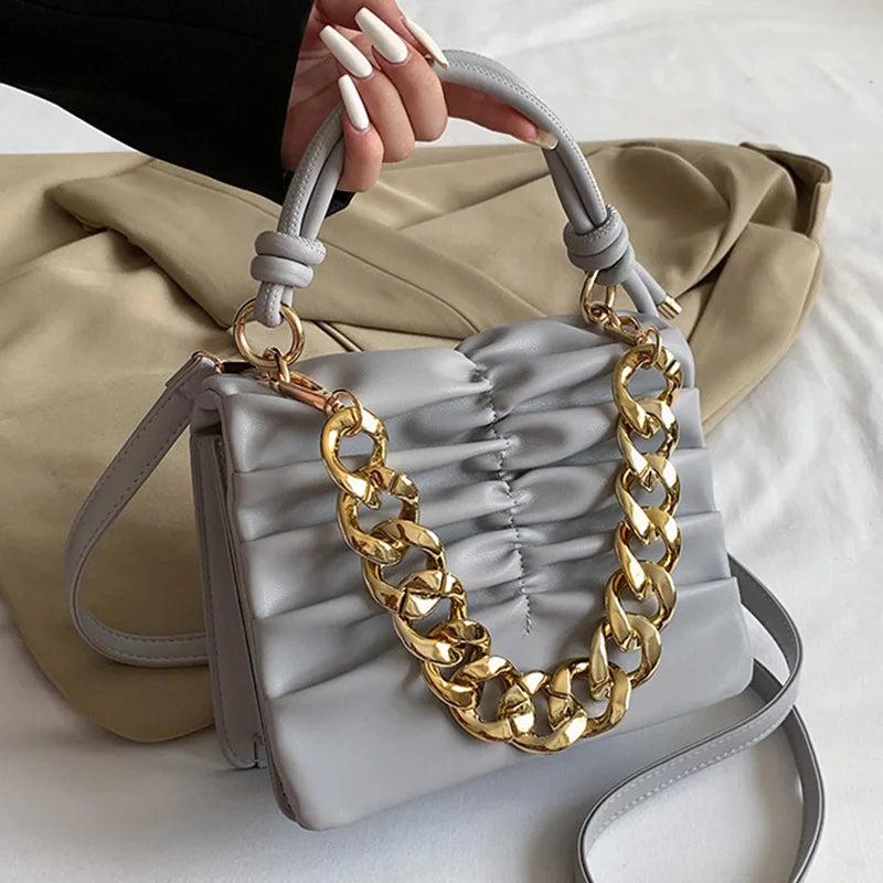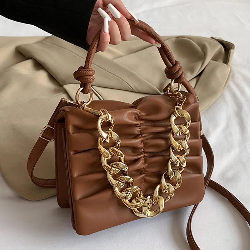 Elevate your style with this chic green handbag made of soft PU leather. Features a fold flap design and a versatile chain strap for an elegant look.