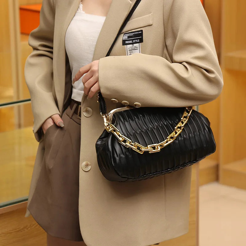 Description:Elevate your style with this elegant green pleated clip bag featuring a silver chain strap. Perfect for a night out or special occasions.Features: Chic green pleated design with silver accents Versatile clutch style with chain shoulder strap Ideal for formal events and parties Compact yet spacious enough for essentials Makes...