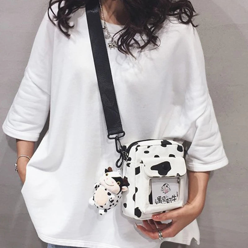 Stay stylish with this Harajuku cow pattern canvas bag crafted for women. It comes with a transparent design and a pendant, perfect for casual outings.