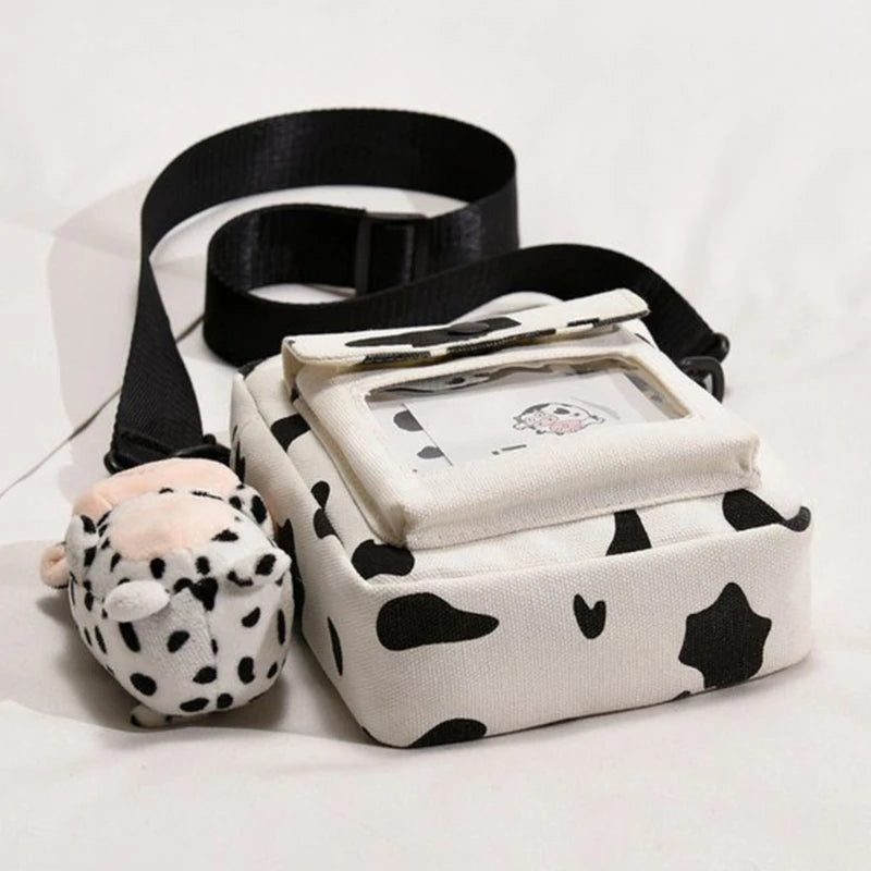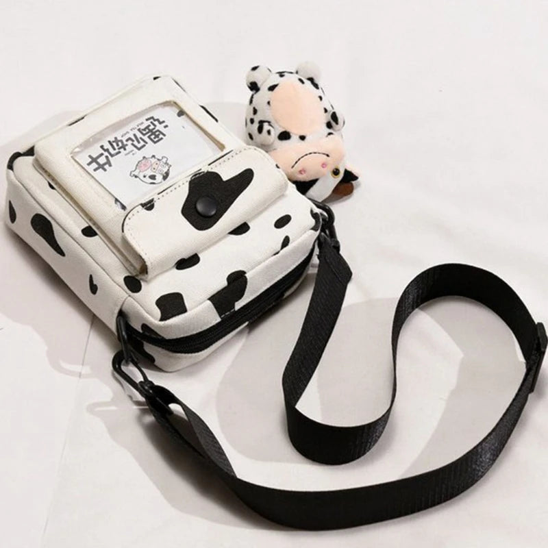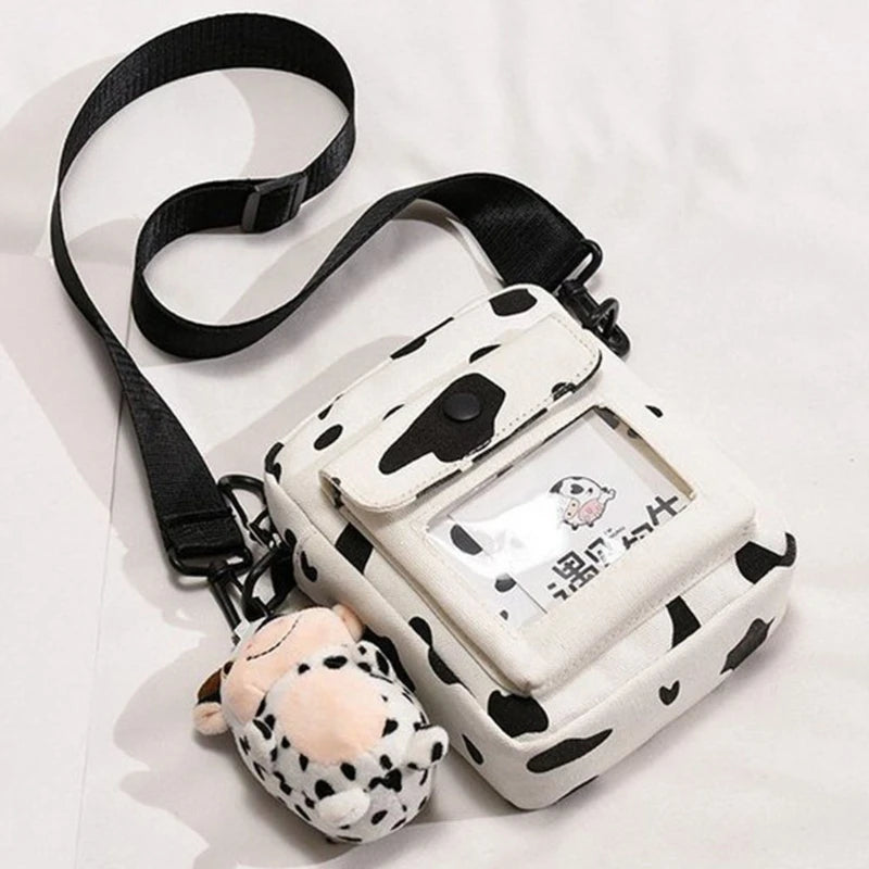 This stylish canvas bag features a fun cow pattern and comes with a cute pendant. It's perfect for everyday use and adds a touch of Harajuku fashion to any outfit.