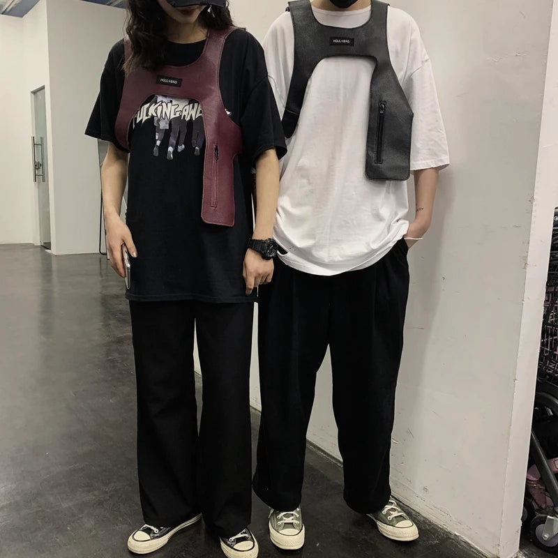 This PU vest bag is a stylish and practical accessory for both men and women. Perfect for adding a touch of Harajuku fashion to your outfit, the bag features multiple compartments and a shoulder buckle for easy carrying.