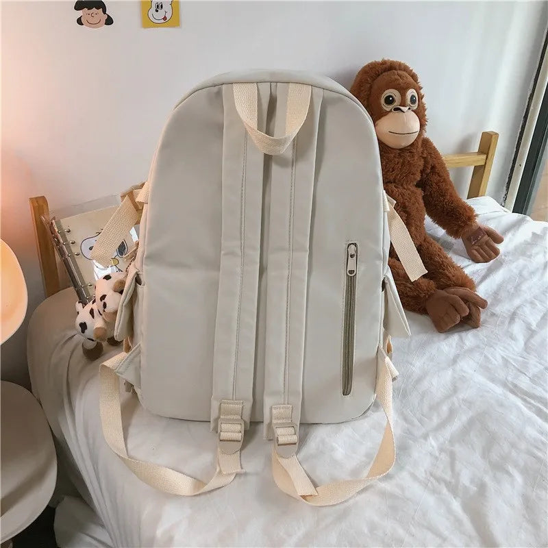 This Harajuku backpack is designed for women and is made of waterproof nylon material. It has a large capacity with many pockets, making it ideal for school use.