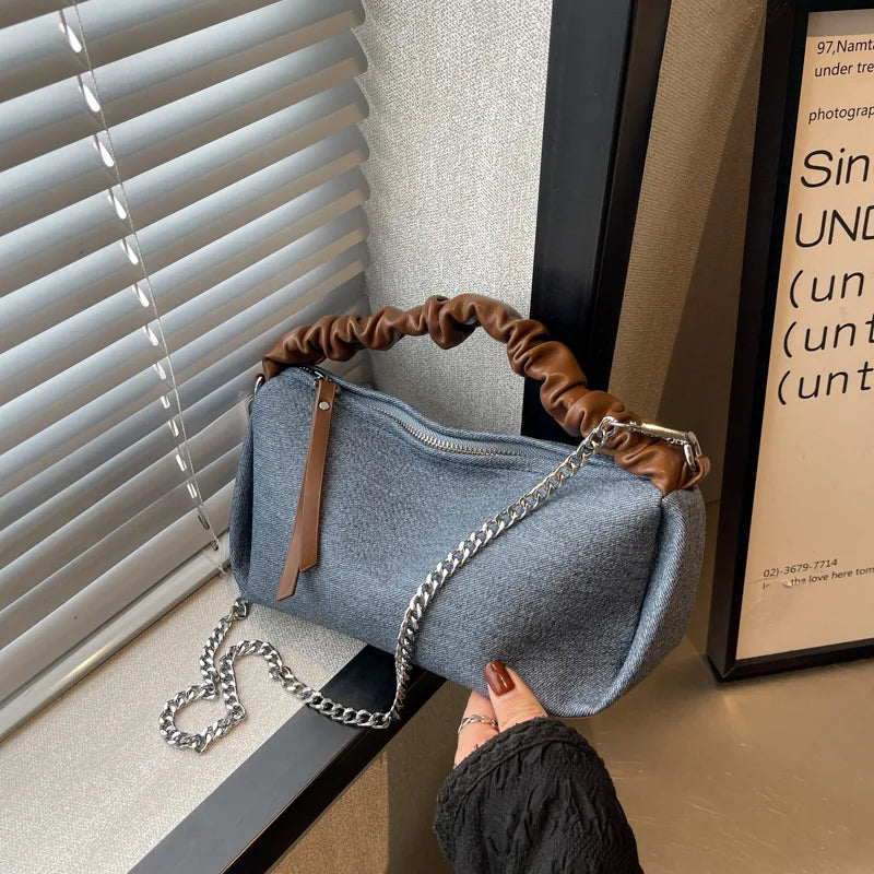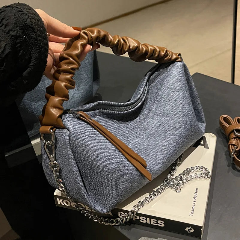 This high-quality denim shoulder bag features a stylish design with chains, perfect for women who love trendy handbags.