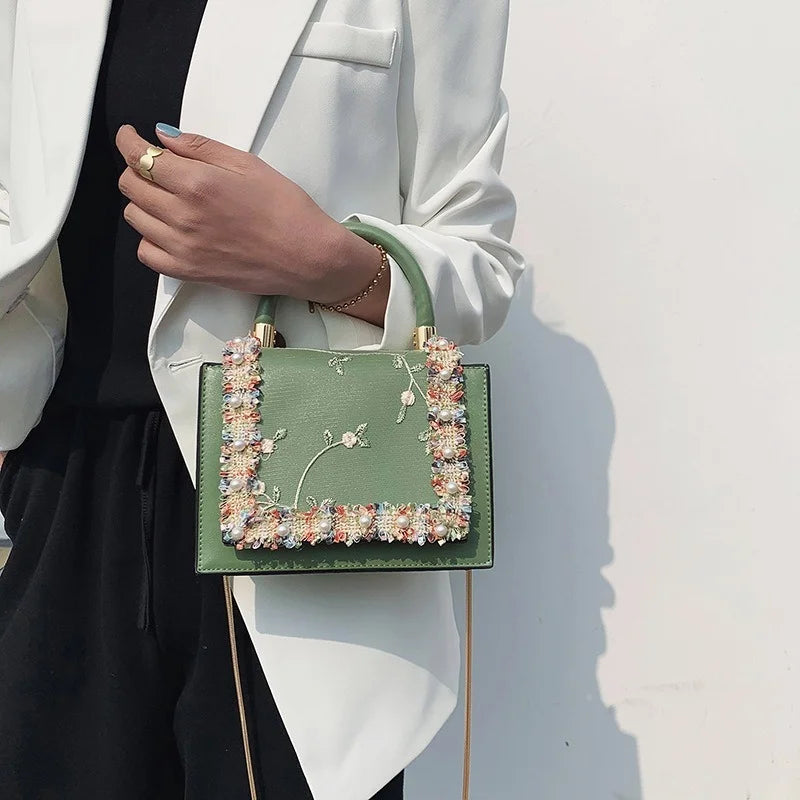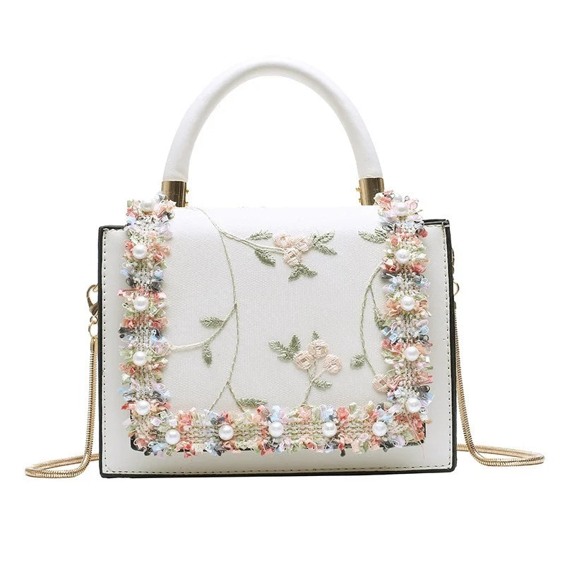 This stylish women's handbag features a high-quality lace design, perfect for Spring. It can be worn as a messenger bag and has a versatile chain shoulder strap.