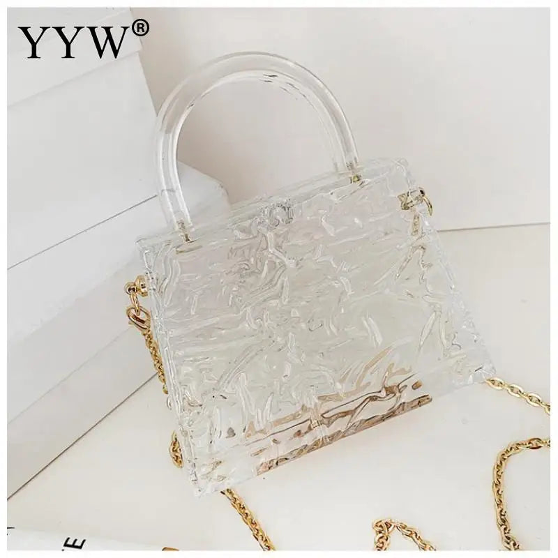 This stylish handbag features a unique ice crack design in a transparent PVC material. It's perfect for carrying your essentials in a trendy and chic way.