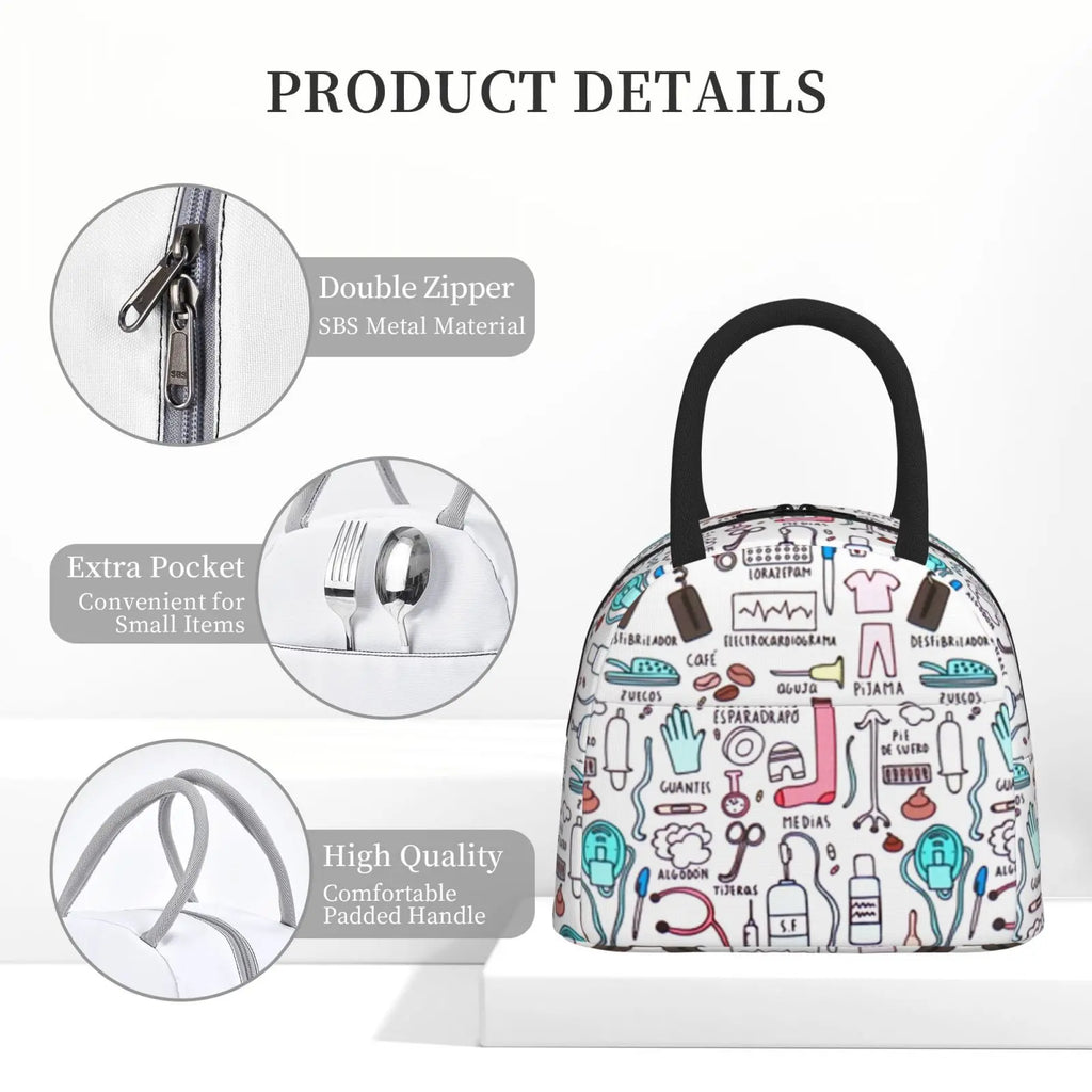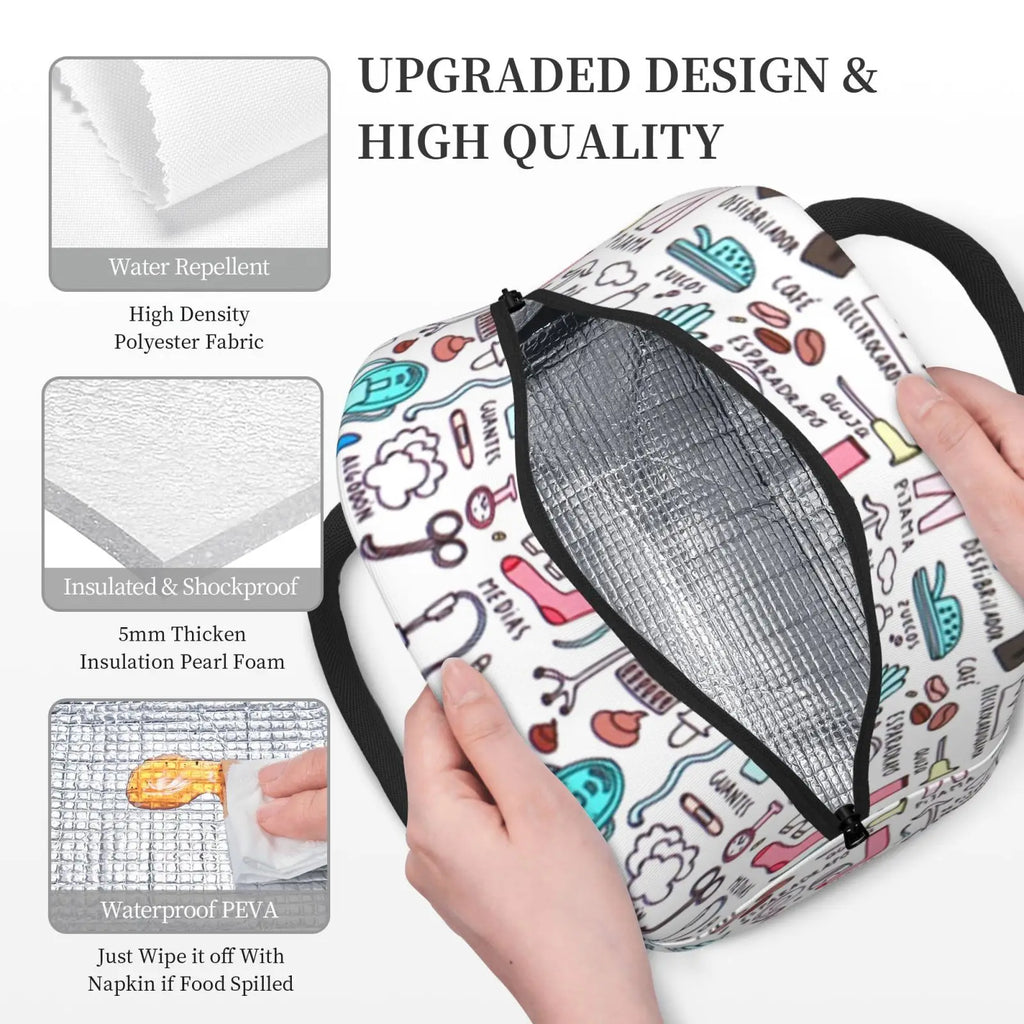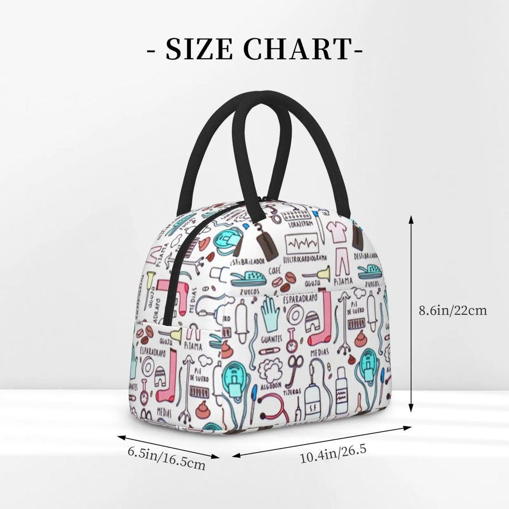 Stay stylish with this insulated lunch bag featuring a cute cartoon nurse print. Keep your food warm or cool while on the go. Perfect for work, school, or travel!