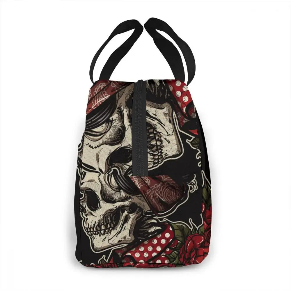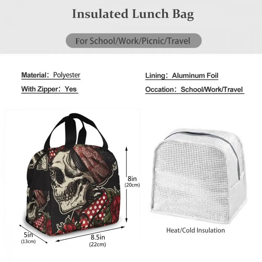 Keep your food fresh and cool with this stylish insulated lunch bag featuring a skull design. Perfect for picnics, work lunches, and more!
