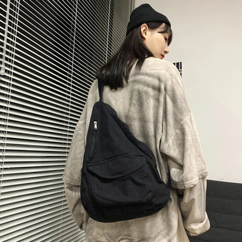This Japanese-inspired sling bag is perfect for both women and men. Made of durable canvas, it features a casual design that can be worn as a shoulder bag or crossbody messenger bag.