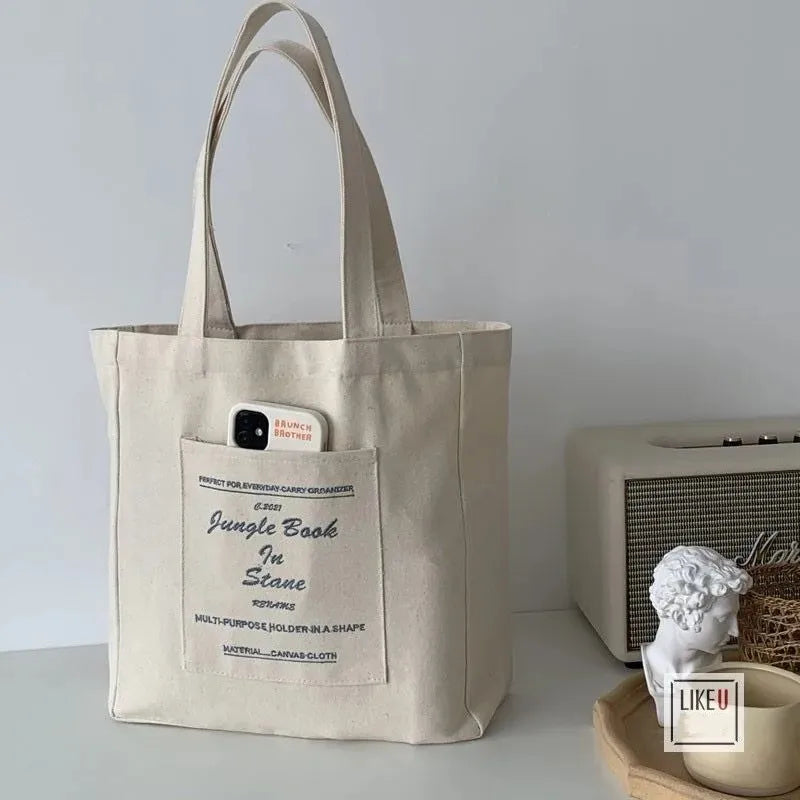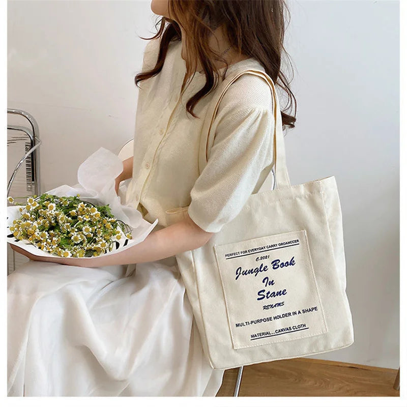 This canvas shoulder bag features a Jungle Book printing design, making it a stylish and fun accessory for women. It has a large capacity, perfect for everyday use or shopping trips. The bag is made of cotton, making it durable and reusable for various occasions like beach outings.
