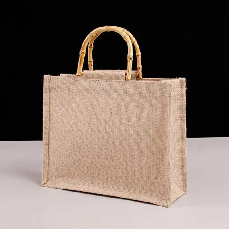 This portable burlap jute bag is perfect for shopping, beach trips, or everyday use. It features bamboo loop handles for a stylish retro look. Big size with plenty of room for essentials.