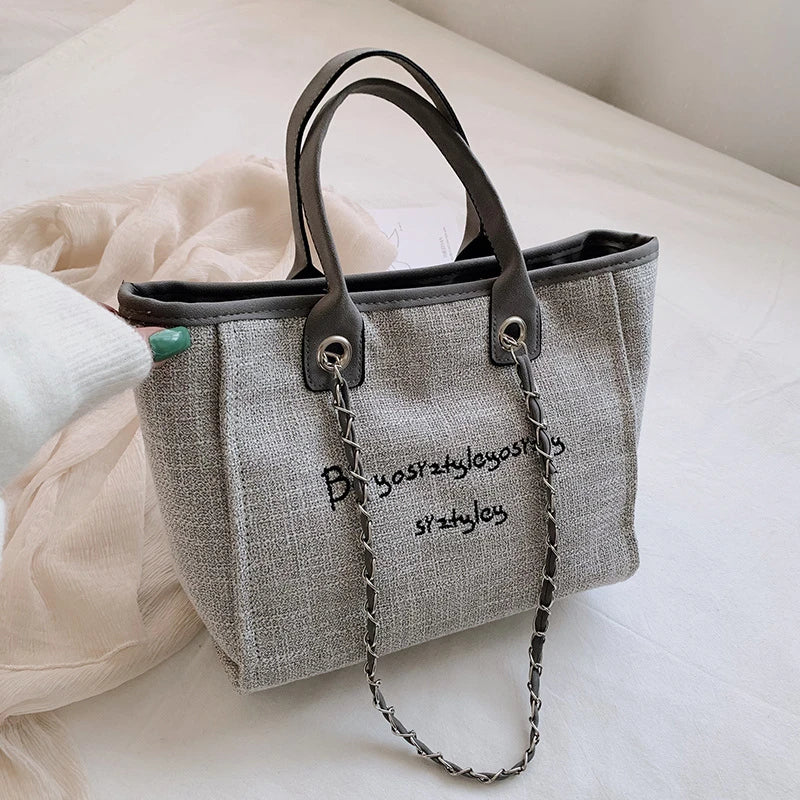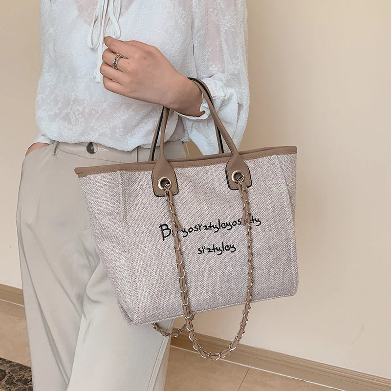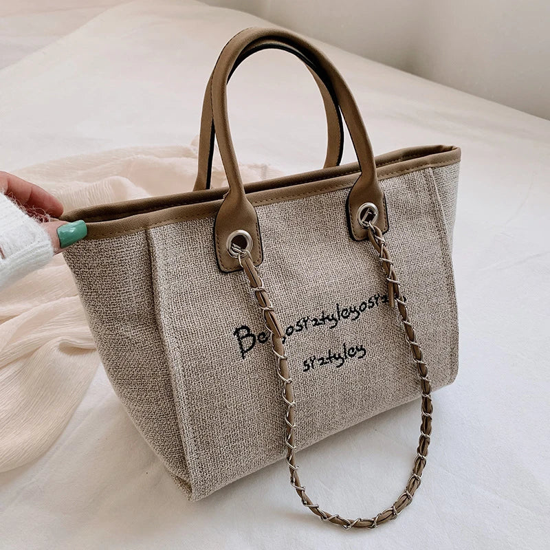 This khaki canvas shoulder bag is perfect for women on the go. It offers a large capacity for travel or work essentials, such as a laptop. The stylish design makes it a versatile accessory for any outfit.