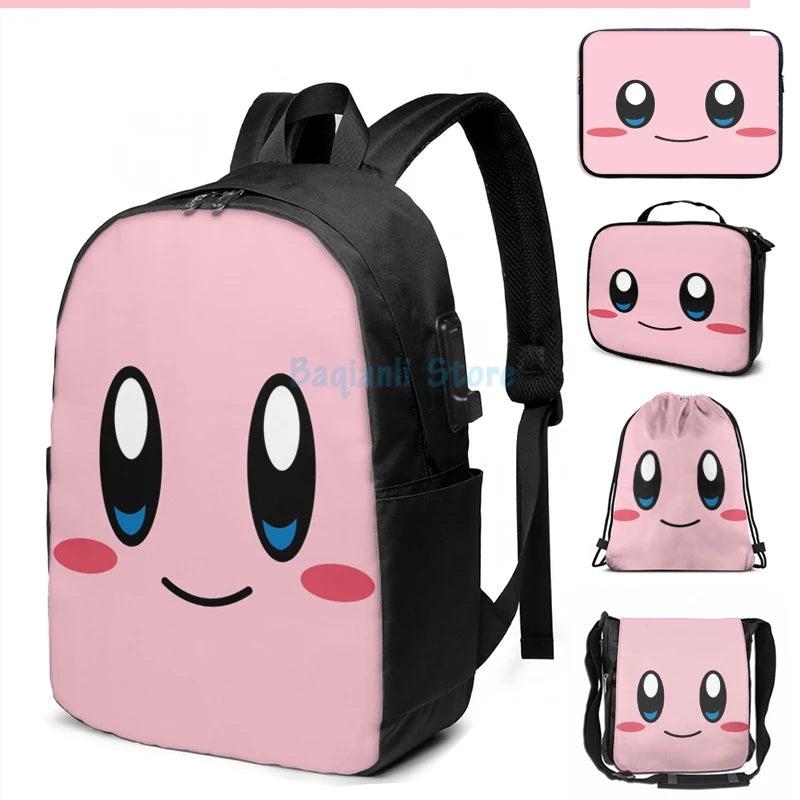 Stay stylish and charged on the go with this funny graphic print Kirby's Face USB charge backpack. Perfect for school and travel.