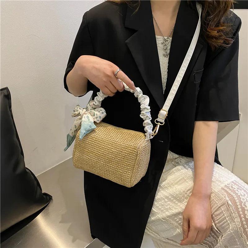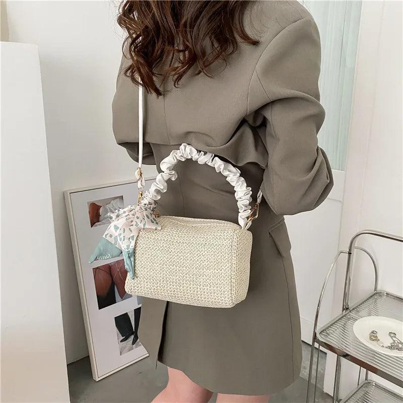 This lady's handbag features retro straw weaving, suitable for one shoulder or crossbody wear. It's a small square bag that adds a touch of elegance to your spring outfit.