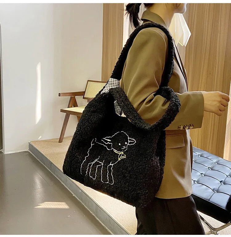 Lamb Fabric Women's Shoulder Bags Large Capacity Embroidery Handbag