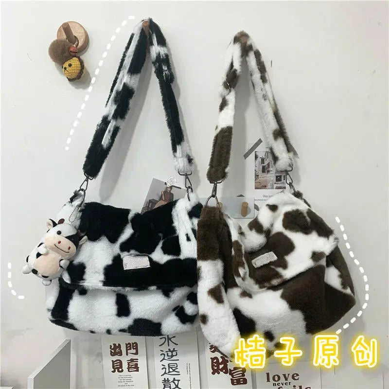 Lamb Wool Cow Pattern Shoulder Bag Canvas Handbag
