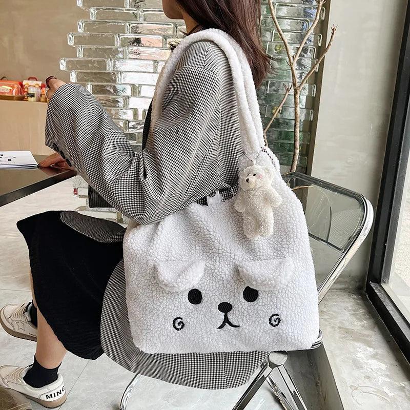 Stay stylish with this lambswool handbag featuring a cute cartoon embroidery design. Perfect for carrying your essentials in a fashionable way.