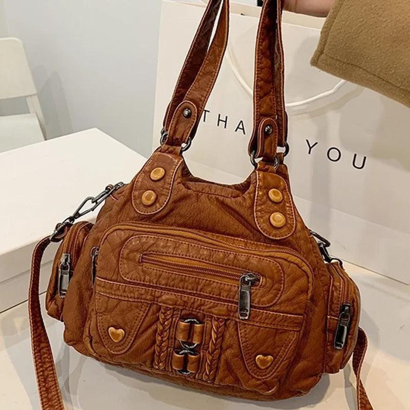 This women's handbag is crafted from leather, featuring a spacious design ideal for daily use. It can be worn as a crossbody or shoulder bag.