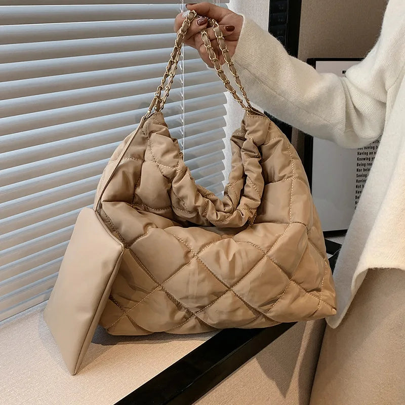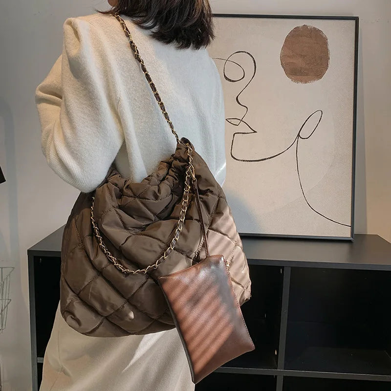 Lattice Plaited Chain Square Nylon Padded Hobo Bag For Women 2 Pc Set