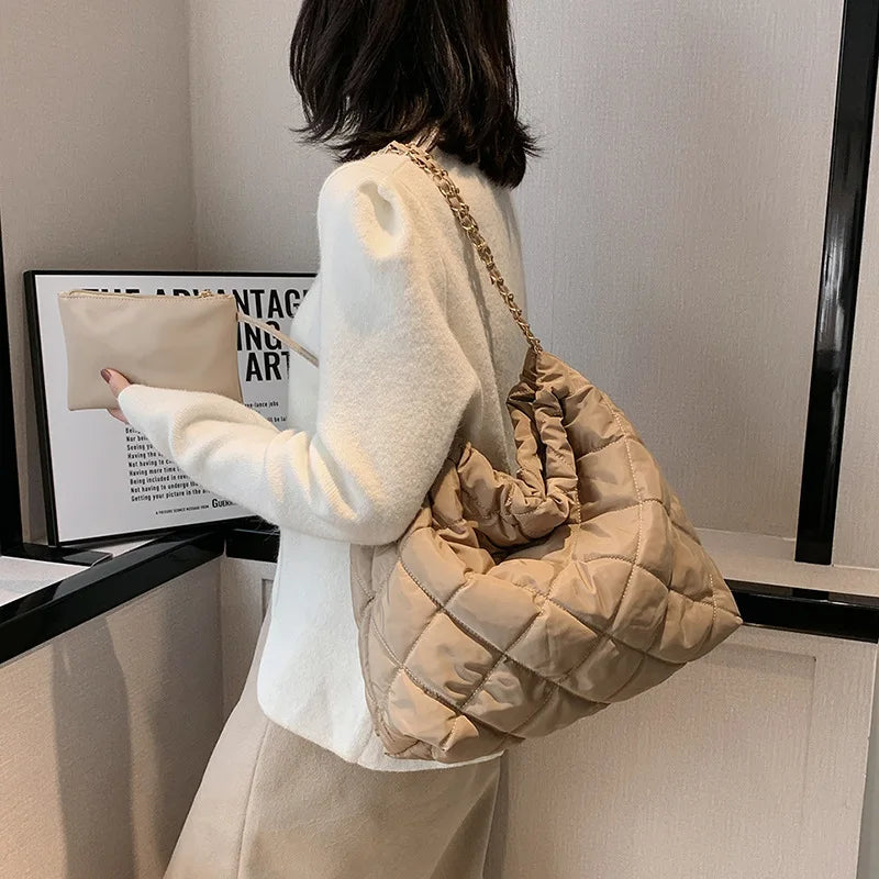 Stay stylish and warm this winter with this quilted shoulder purse. It's a big shopper handbag that's perfect for all your essentials.