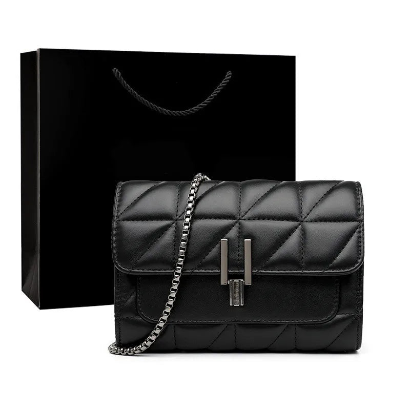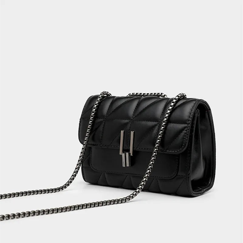 This chic leather crossbody bag is the perfect accessory for women. It features a chain strap and can be used as a shoulder bag or a clutch for versatility.