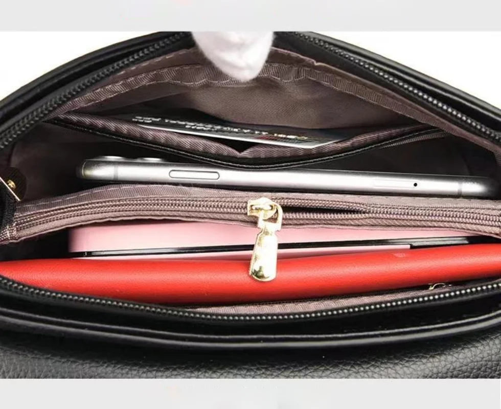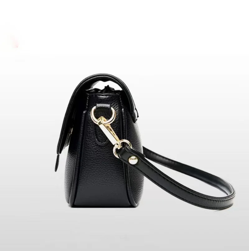This classic leather crossbody bag is designed for women who appreciate style and functionality. It features a square shape with a flap closure and an adjustable shoulder strap.