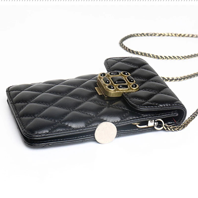 This stylish handbag is made from premium lambskin leather with classic quilting and a chain strap. It is designed to carry your mobile cell phone as well as other essentials. Perfect for casual or formal occasions.