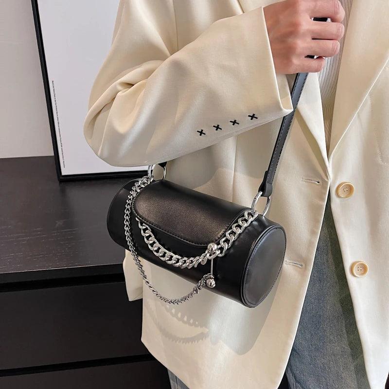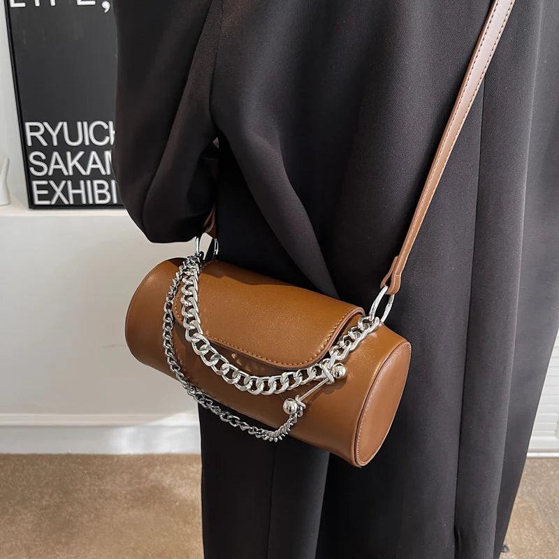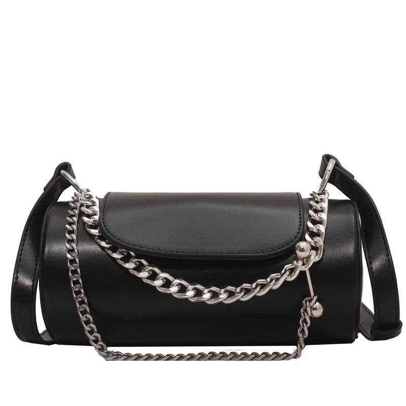Elevate your style with this leather cylindrical messenger bag featuring a chain strap. This solid handbag is perfect for women who love a trendy and versatile accessory.