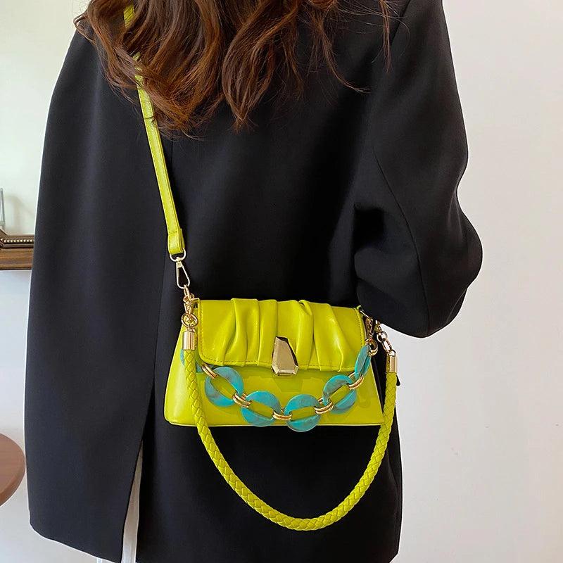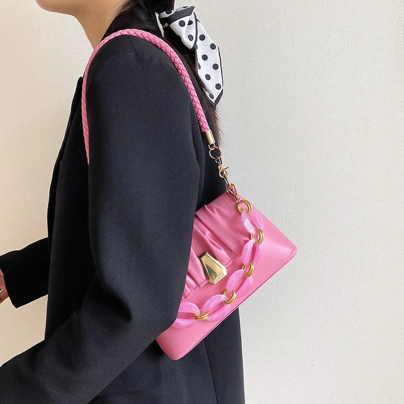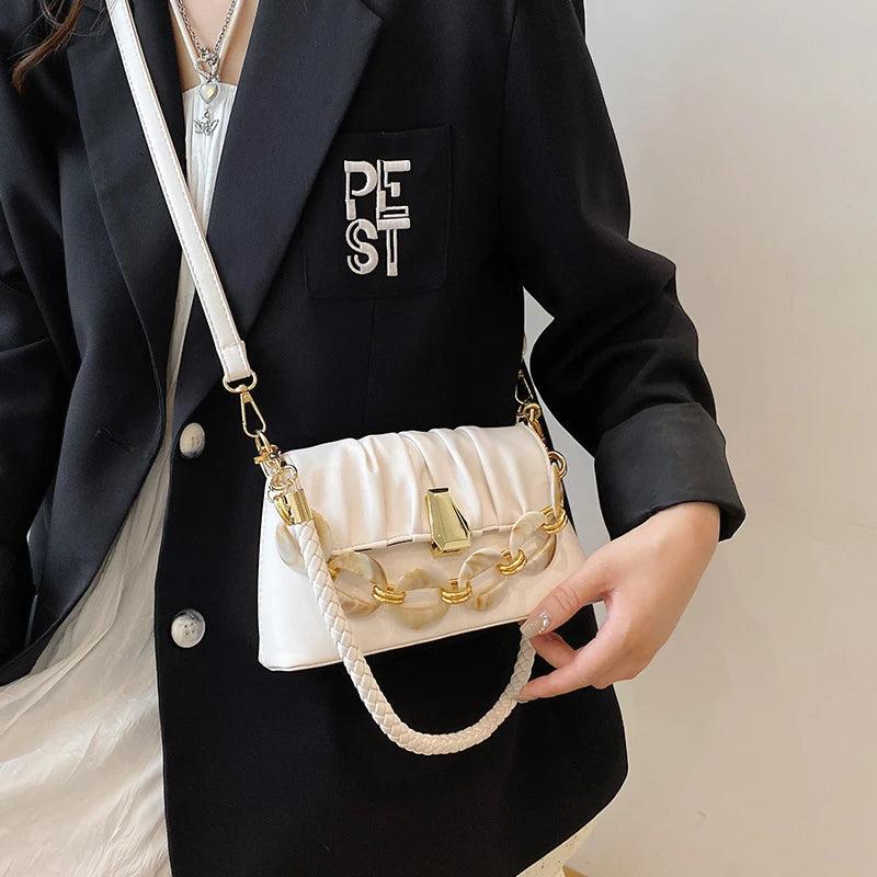 Elegant and stylish leather shoulder bag with beading chain design. Perfect for carrying your essentials with a flap closure. Great for both casual and formal occasions.