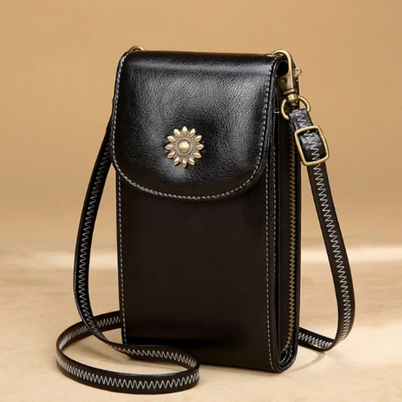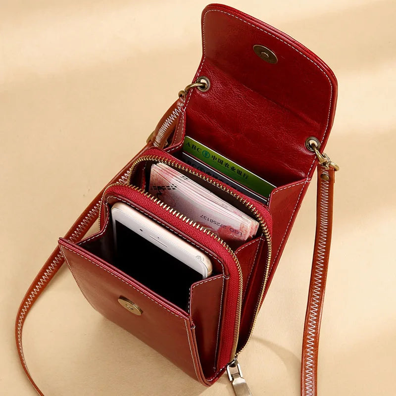 This leather women's bag is perfect for carrying your essentials. It features a phone pocket and is ideal for girls.