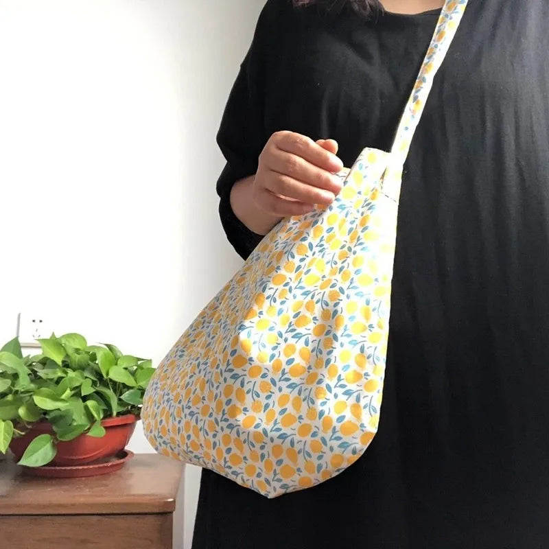 This shoulder bag features a vibrant lemon print, perfect for teenage girls and students. It has a big capacity for shopping and daily use, made of foldable cotton material.