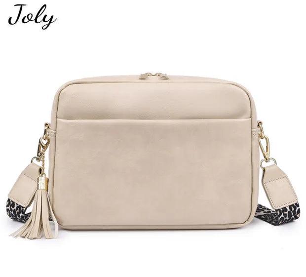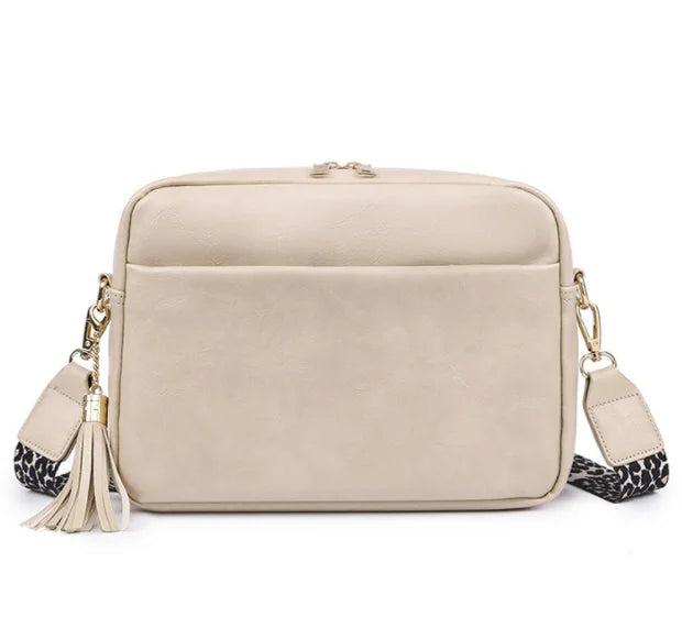 Stay stylish with this midsize crossbody bag made of high-quality vegan leather. The bag features a leopard print adjustable strap and a practical zipped closure.