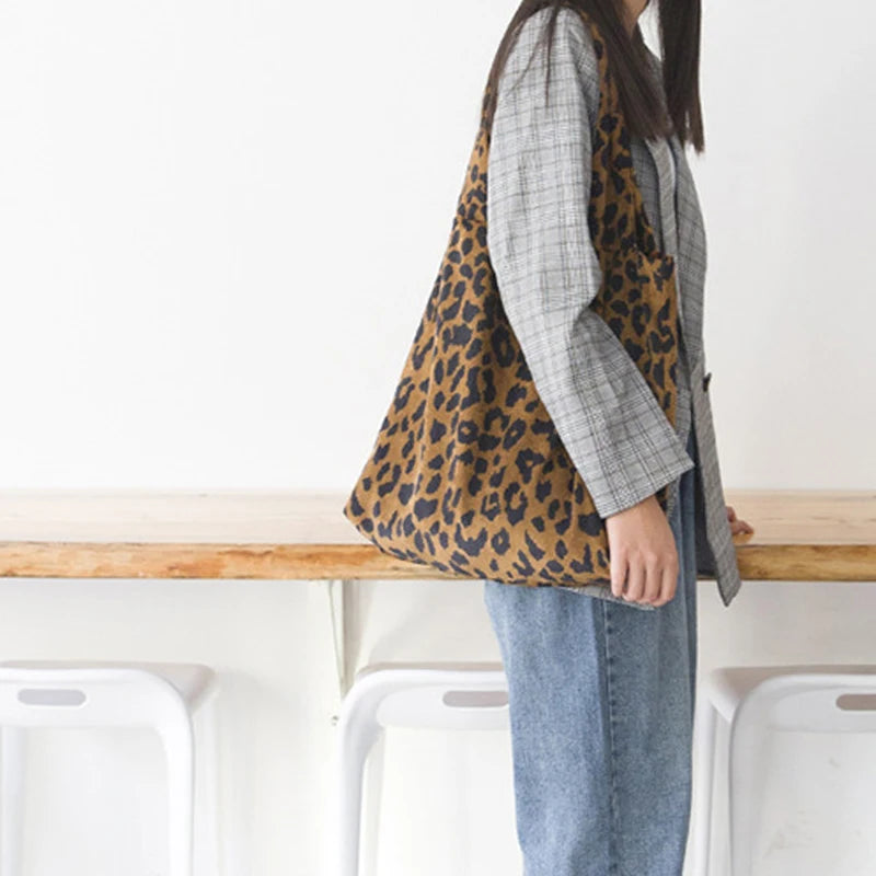 Stay stylish while shopping with this leopard print cloth bag. It's eco-friendly, foldable, and perfect for carrying groceries or everyday essentials.