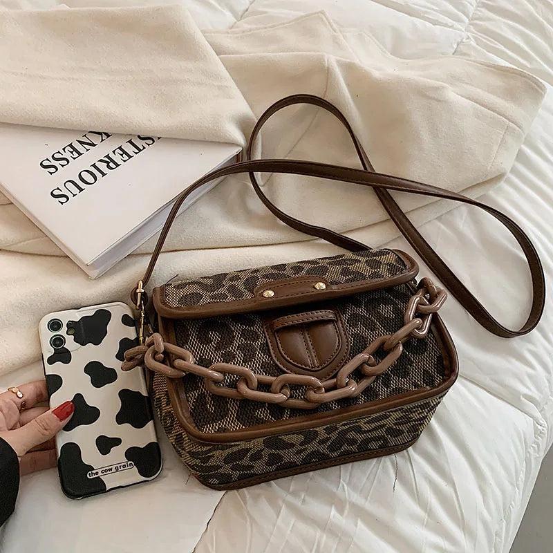 This trendy leopard print shoulder bag is perfect for stylish women looking to make a statement. It features a chain strap and can be used as a crossbody or tote bag.