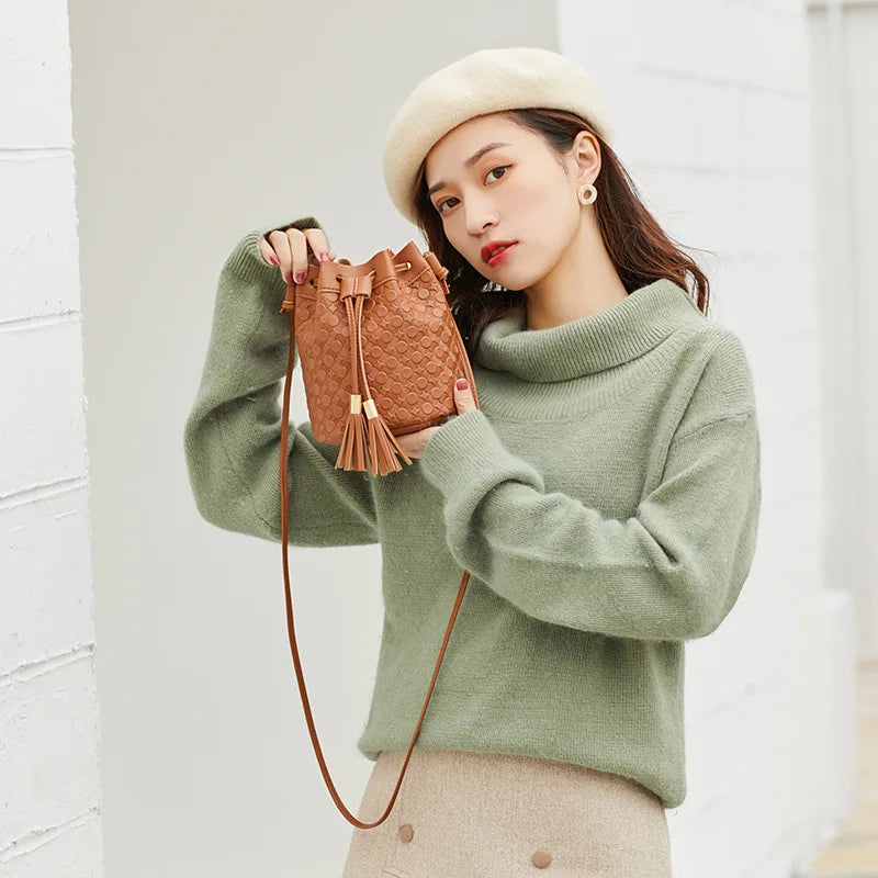 Elegant and stylish women's bucket bag with a vintage design featuring lychee pattern. Ideal for everyday use as a shoulder bag or crossbody tote.