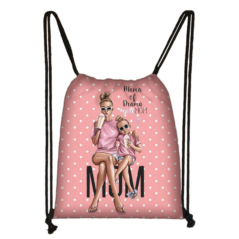 This Mama Print Drawstring Bag is perfect for travelling, shopping, or casual use. It features a charming design ideal for princess girls and ladies.
