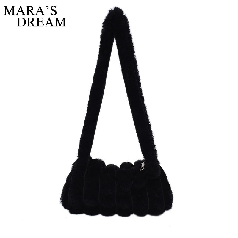 Stay cozy and stylish with Mara's Dream pleated faux fur shoulder bag. Perfect for autumn and winter, this fluffy messenger handbag is sure to make a statement.