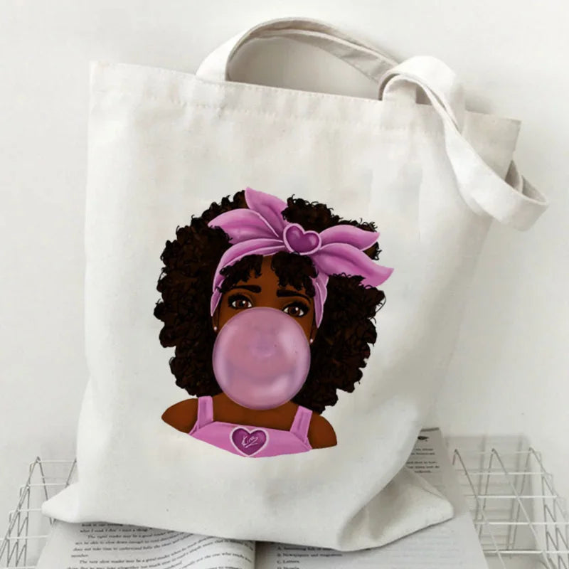 This shoulder bag features an African curly hair girl design, perfect for summer. It has a large capacity and is made of durable canvas material.