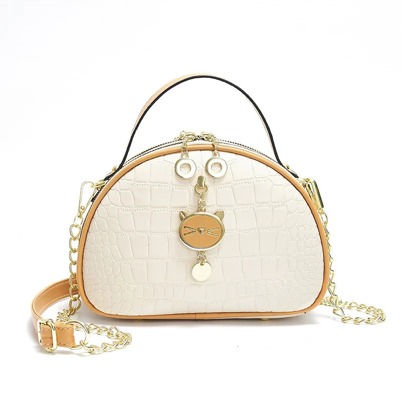 This stylish small round bag is perfect for autumn. It features a chain strap and can be worn as a one-shoulder handbag for a chic look.