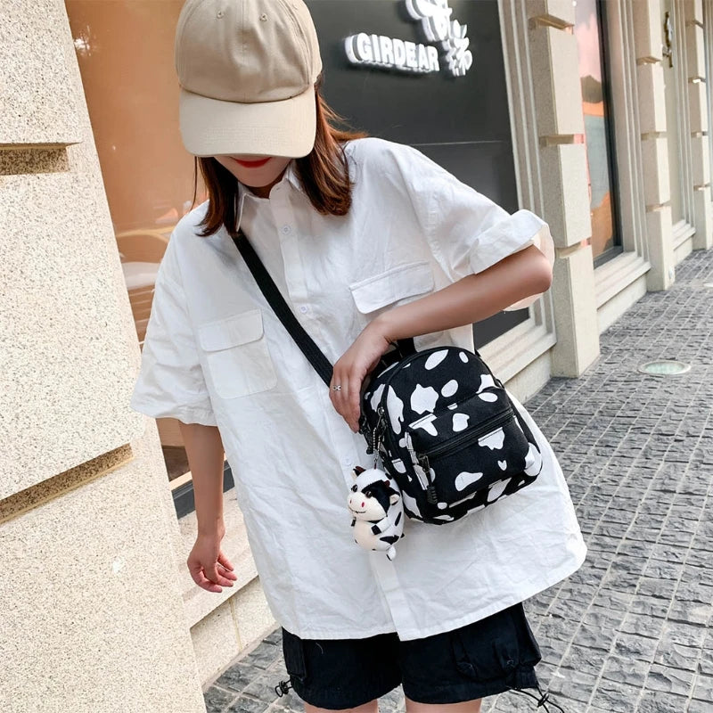 This stylish mini canvas daypack features a cow print design and comes with a plush pendant. Perfect for women, ladies, and girls who want a trendy backpack.