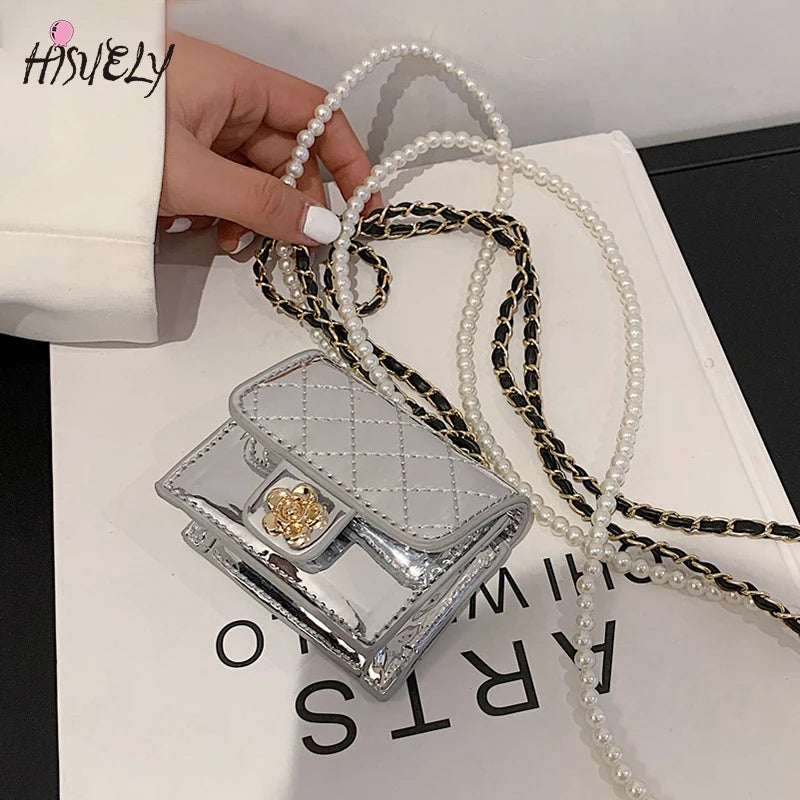 Stylish and compact mini leather bag designed for women. The bag features a hanging neck design with camellia pattern, suitable for carrying earphones, lipstick, and keys. Comes with pearls chain for versatile wearing options.