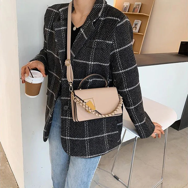 This stylish mini square bag is perfect for carrying your essentials. Features a chain strap that can be worn diagonally across the body. Available in a solid color.
