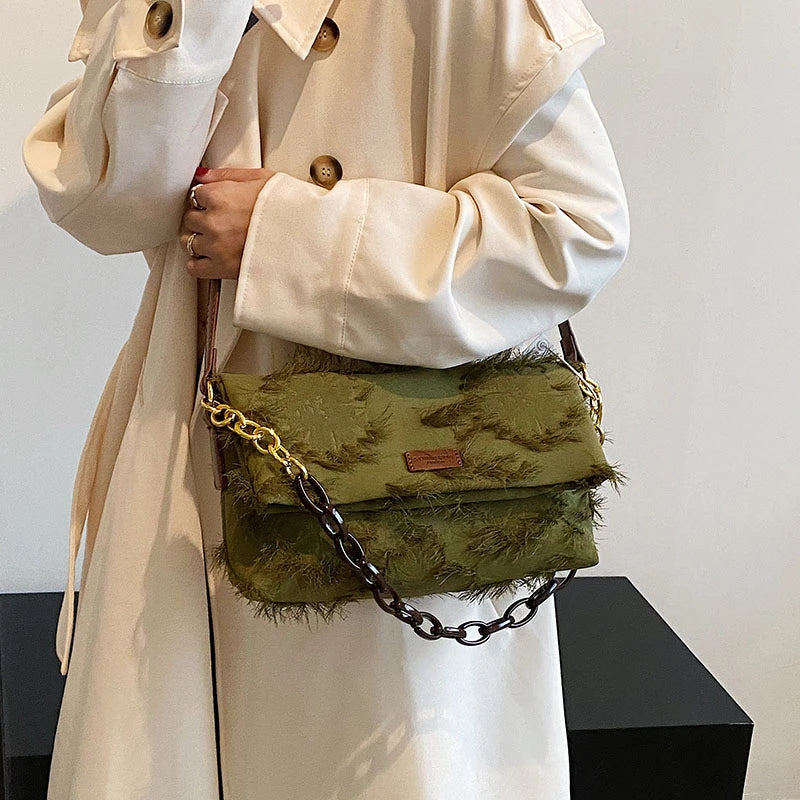 Stay trendy and chic with this stylish shoulder bag made of durable canvas featuring intricate embroidery and an acrylic chain strap. Perfect for on-the-go fashionistas!