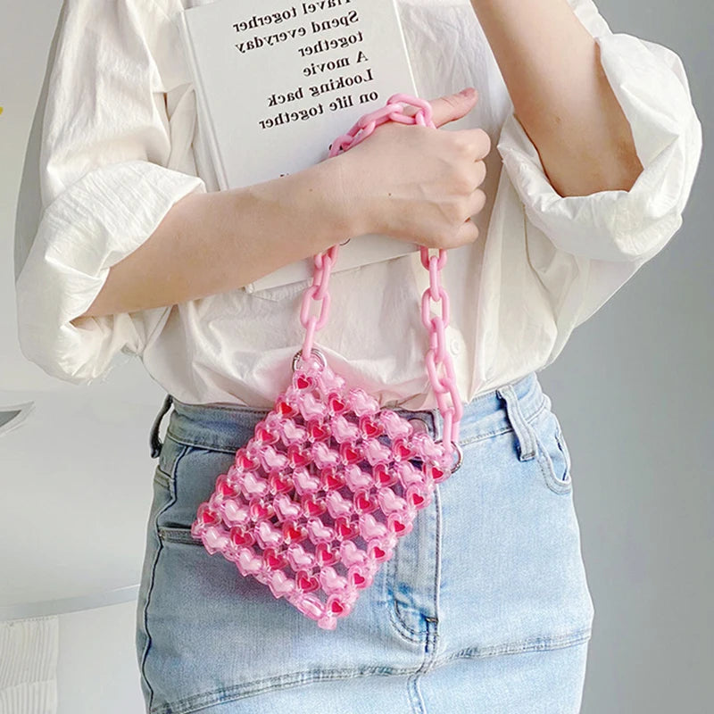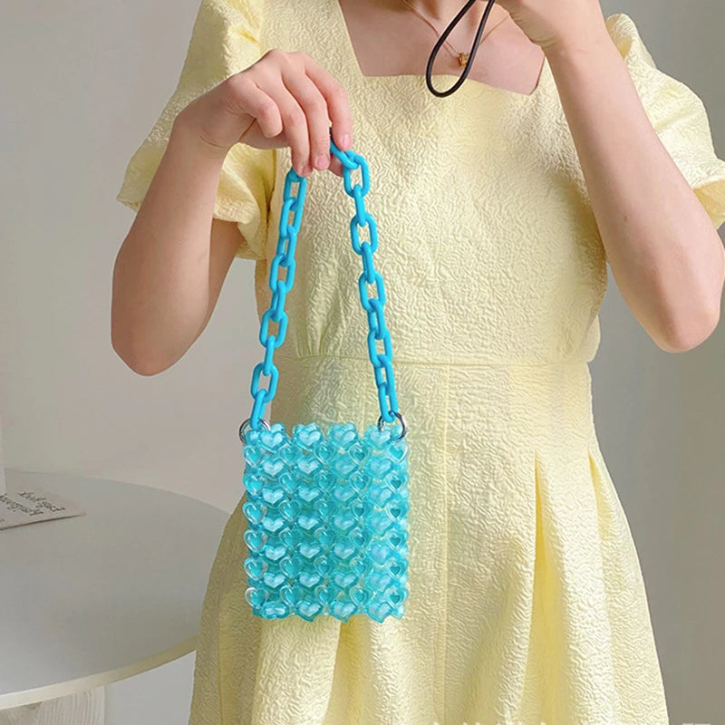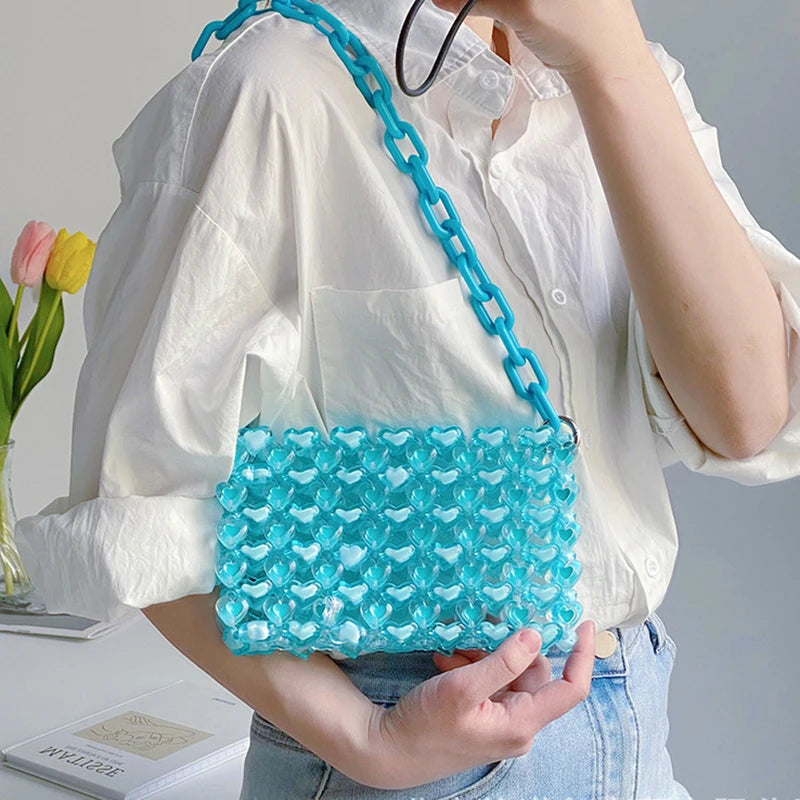 Elegant and stylish woven bag featuring love beads in various colors. This cross-body shoulder bag is perfect for women who love a touch of glamour.