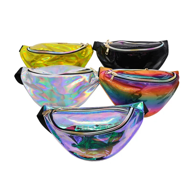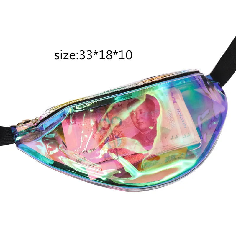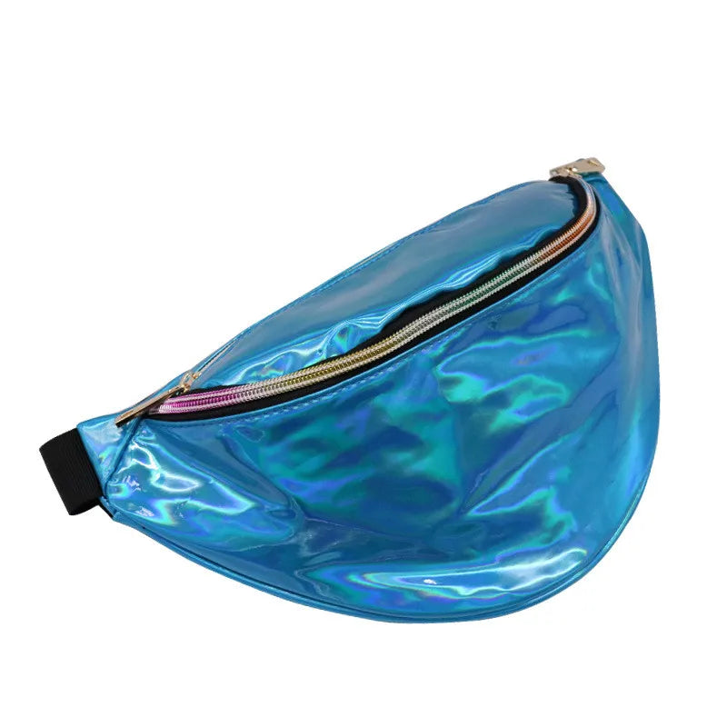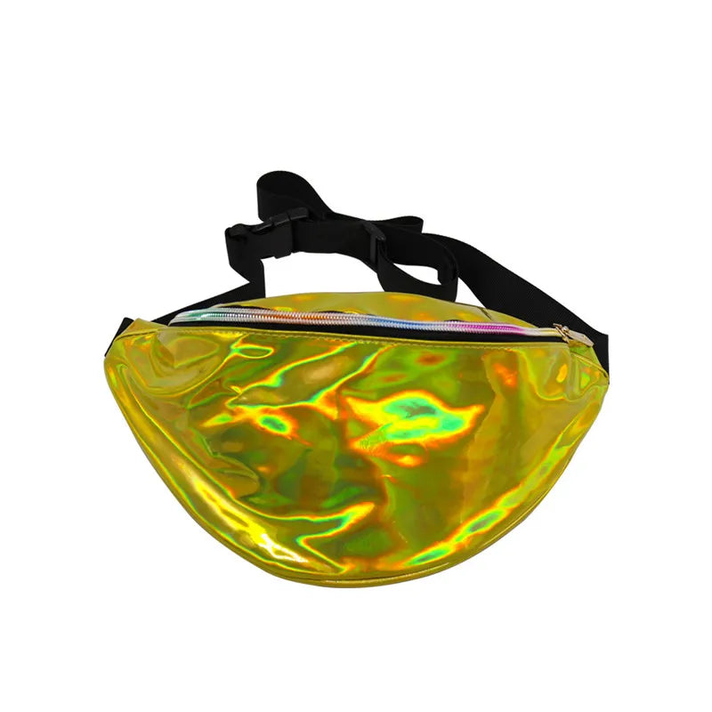 This Fanny Pack is designed for women and can be used as a waist bag, leg bag, chest bag, or shoulder bag. It features a unique steam punk style with reflective elements and a laser design.