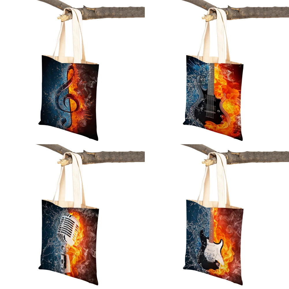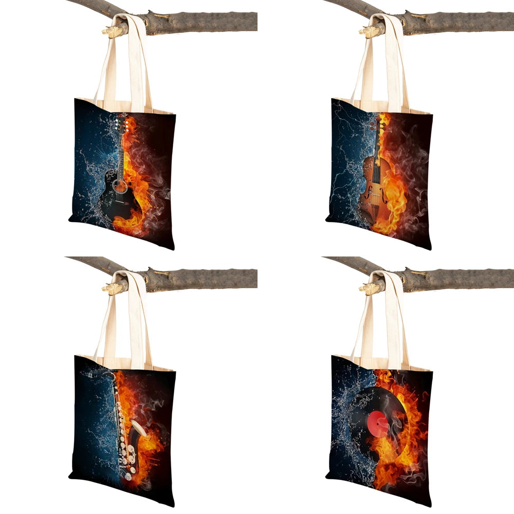 Music Note Tote Handbag Guitar Microphone Violin Reusable Canvas Shopping Bag