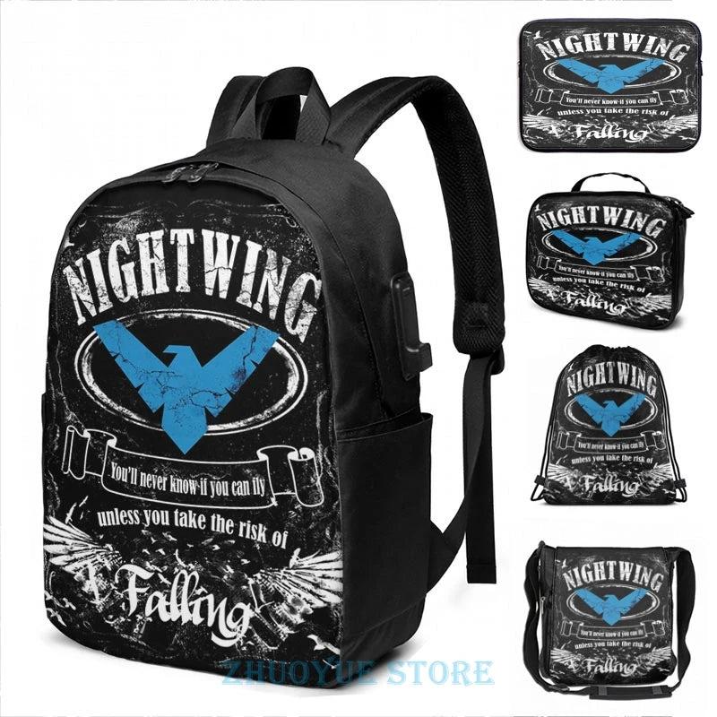Carry your essentials in style with this nightwing-themed backpack featuring a funny graphic print. It includes a USB charge port for on-the-go convenience.