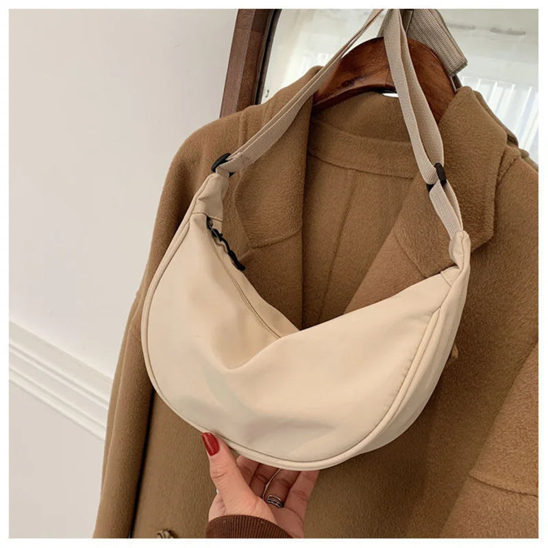 Stay stylish and organized with this dumpling-shaped hobo shoulder bag that is made of durable and waterproof nylon material.