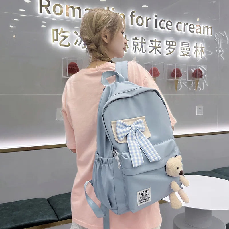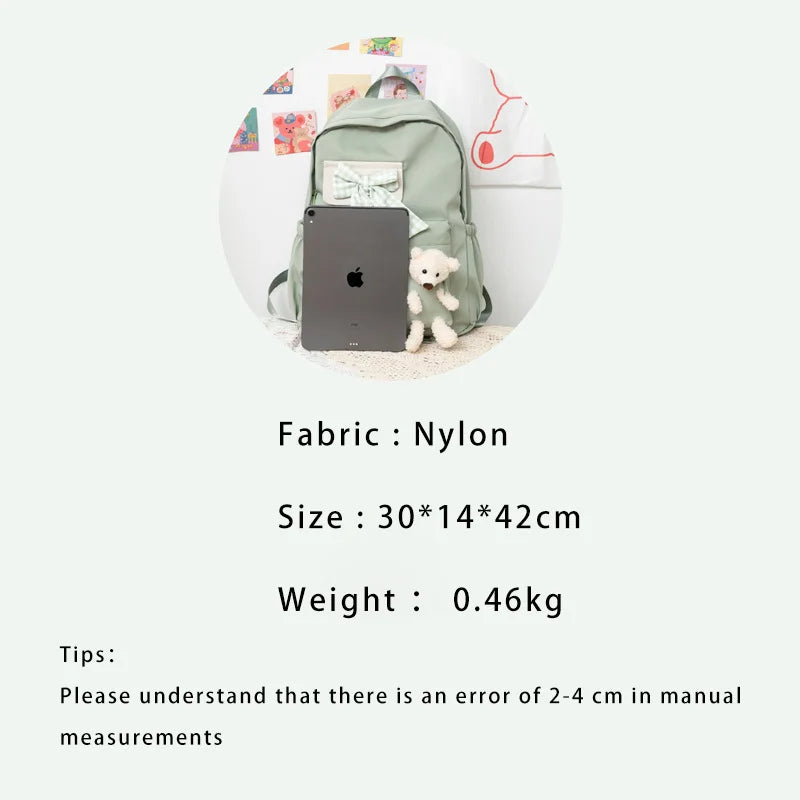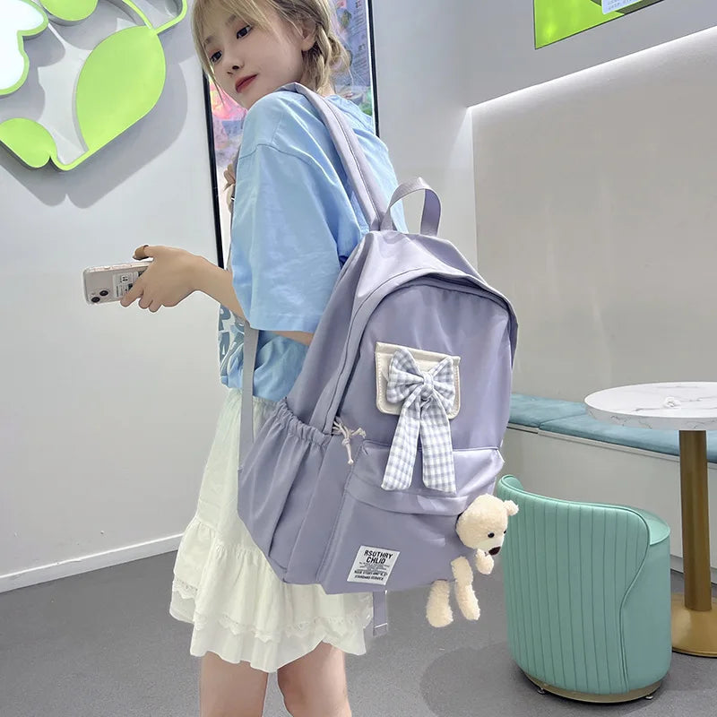 This nylon backpack is perfect for college students, featuring a cute bow and bear design. It's great for school or travel.