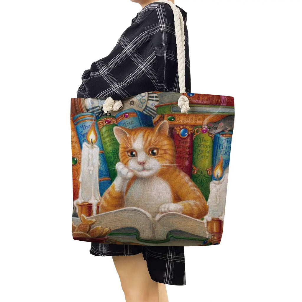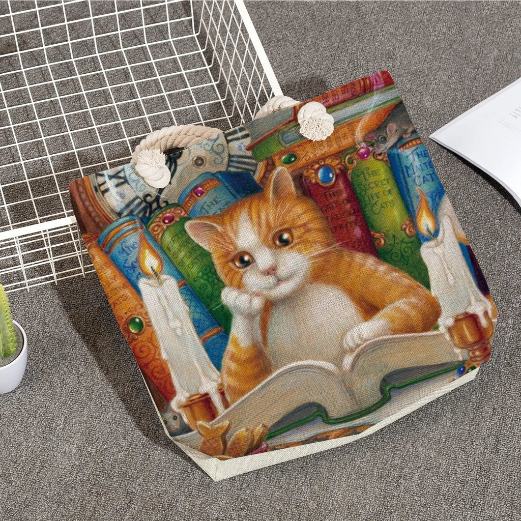 Oil Painting Cat Printed Womens Tote Bags Thick Rope Linen Reusable Shopping Bag